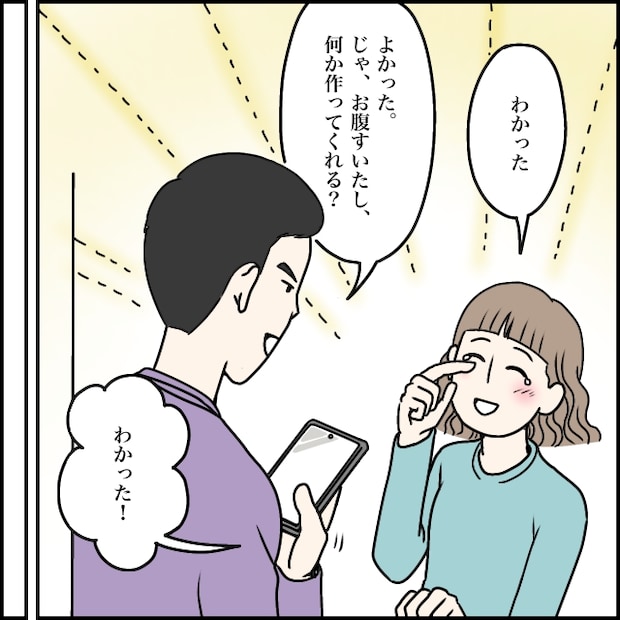 このまま別れるなんて嫌。せめてちゃんと話がしたい。タカシからの連絡を待っている間、私はスマホを片時も手放せませんでした。そして翌日、旅行から帰ってきたのか、タカシから「今から行く」と連絡がありました。私は胸の前でスマホを握りしめ「よかった!」と安堵します。