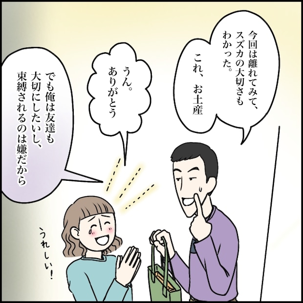 タカシは部屋に入ると「今回は離れてみてスズカの大切さがわかった」と言い、旅行先で買ったお土産を渡してくれました。旅行中も私のことをちゃんと考えてくれたことが嬉しくて、私は涙目で「うん、ありがとう」と受け取ります。けれどその直後、タカシは「でも俺は友達も大切にしたいし、束縛されるのは嫌だから」と話し始めました。