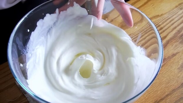 ツノが立つまで、しっかりと泡立て器で混ぜます。少し柔らかめがおすすめです。