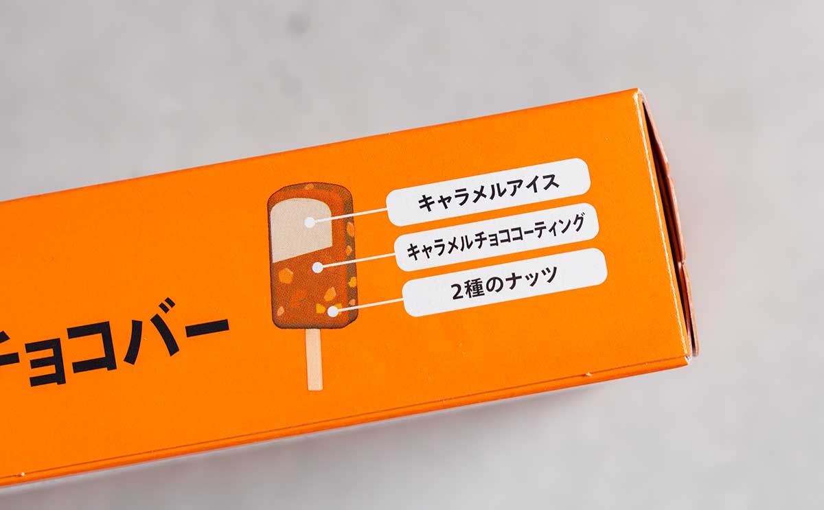 セブンプレミアムブランドから登場したこの商品は、シュガーコートしたマカダミアナッツクランチと、アーモンドクランチを混ぜ込んだキャラメルチョココーティングが特長のキャラメルアイスバーです。