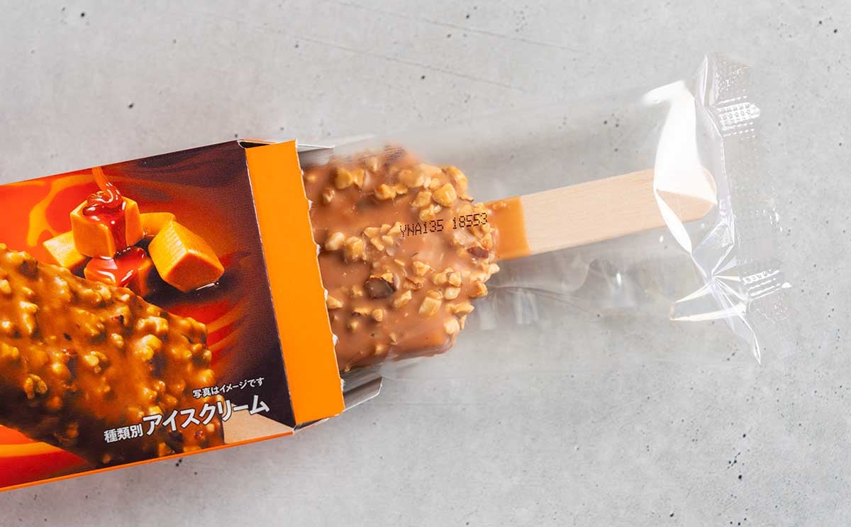 コーティングもアイスもキャラメル風味なので、食べた瞬間からキャラメルの甘い味わいを楽しむことができますね。また、ナッツもたくさん使われているから、香ばしい風味もしっかりと味わえて最高! 冬アイスらしいコク深いおいしさです。