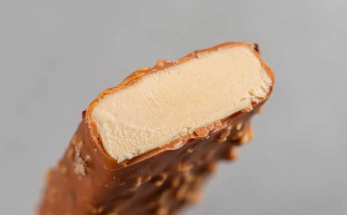 さっそく食べてみたところ、コーティングのパリッとした食感と、ナッツのカリッとした食感が伝わってきて、とても楽しい! 表面の歯ざわりがよく、中のアイスは滑らかな舌ざわりに仕上がっています。