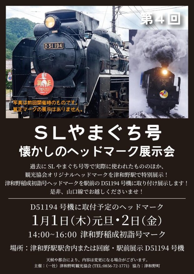 津和野町観光協会では駅前展示のD51194号機を活用し、「第4回 SLやまぐち号 懐かしのヘッドマーク展示会」を開催します!