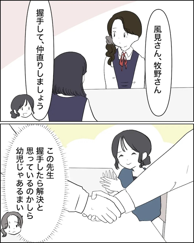 すると、「風見さん、牧野さん、握手して仲直りしましょう」と言い出す水原先生の言葉に、「この先生、握手したら解決だと思っているのかしら・・幼児じゃなるまいし」と心の中で呟きました。