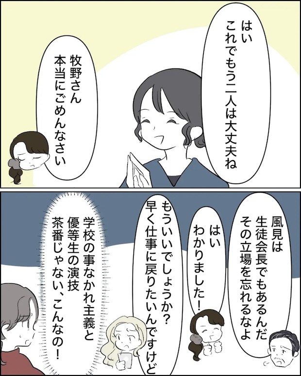 「はい。これでもう2人は大丈夫ね」水原先生がそう言うと、「牧野さん、本当にごめんなさい」と水原先生の隣で謝る風見さんに、「風見は生徒会長でもあるんだ。そのア立場を忘れるなよ」学年主任の先生が言うと、「はい、わかりました!」と元気いっぱいに挨拶しました。そのやりとりを見た風見さんの母さんは、もういいでしょうか?早く仕事に戻りたいんですけど」としかめっ面で言う風見さんのお母さん、その様子を見て「学校の事勿れ主義と優等生の演技、茶番じゃないこんなの!」今回の話し合いは私たちにとって、何も意味がないことがわかりました。