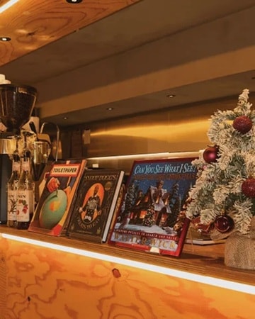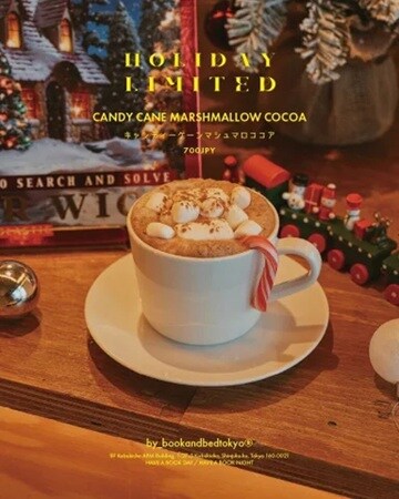 「BOOK AND BED TOKYO SHINJUKU」は、無数の本棚に囲まれた独特な空間デザインが特徴だ。ホリデーシーズン中は、店内の装飾とともに、この時期にぴったりの書籍を楽しめる。温かい「Candy Cane Marshmallow Cocoa」を片手に、お気に入りの本をゆっくりと読む時間は、新宿の喧騒を忘れさせてくれる特別なひとときになる。