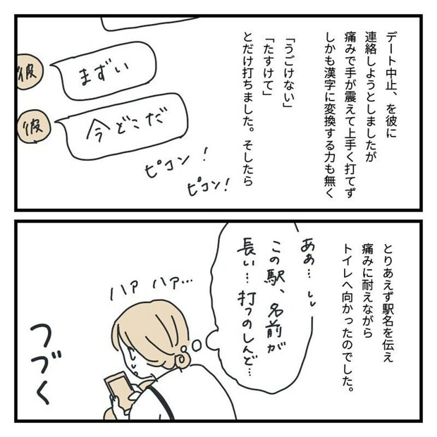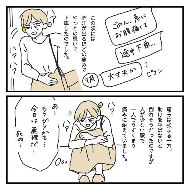 お店を検索し、彼氏とシェアして数分後、軽い腹痛を感じます。そしてそこから痛みはどんどん強くなり脂汗が出るほどに。彼氏にそのことを伝え、電車を降りるも痛みのあまりその場にうずくまり、動けずにいました。彼氏とはその間も連絡を取り合い、降りた駅名を伝え、どうにかトイレへと向かいます。