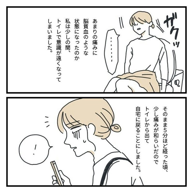 どうにかトイレへと辿り着くことができたキクチさん。あまりの痛みに意識が遠のくような感覚になり、しばらく動けずにいました。5分ほど経ち、痛みが和らいだタイミングで自宅へ戻ることに。