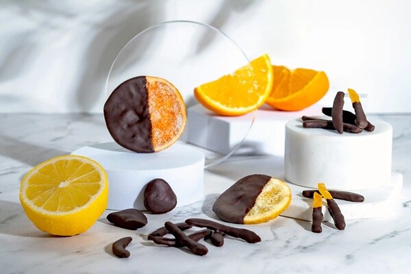 JAPAN JUICEの「オランジェット」は、国産柑橘のピールや輪切りの果実を、砂糖とたっぷりの果汁でじっくり蜜漬けし、ダークチョコレートでコーティングしたバレンタイン商品。