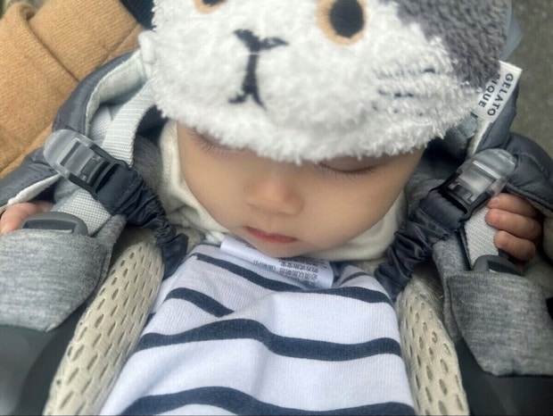 5か月の娘さんが抱っこひもで寝ている様子を、ママ自身の目線から撮影した写真です。かわいらしい寝顔からは、ママといられる安心した気持ちが感じられます。娘さんにとっても、幸せな空間なのでしょうね。