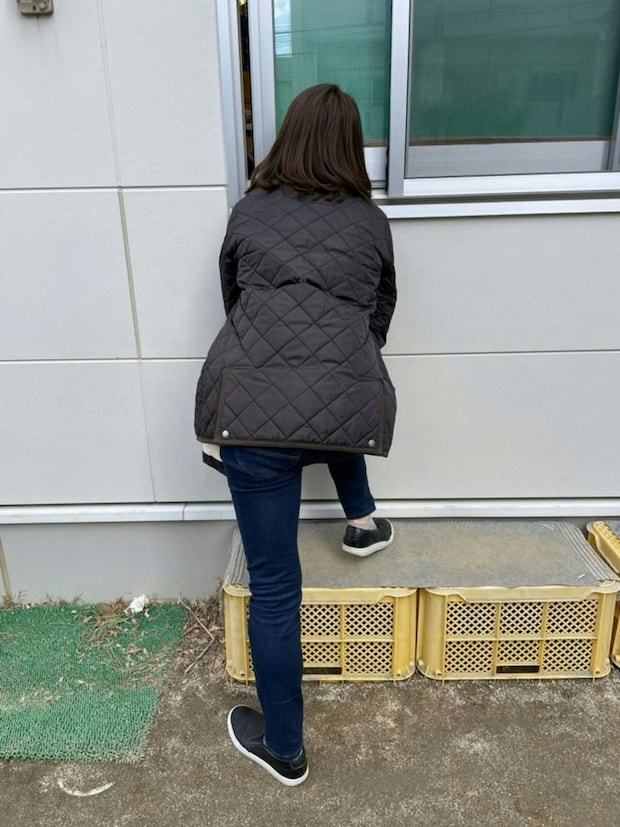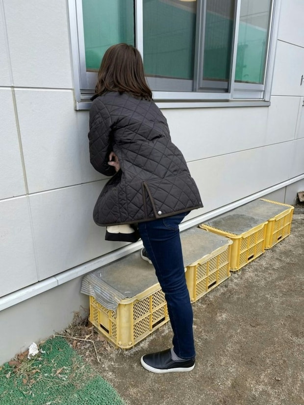 園児に気付かれないようにこっそり窓からのぞく母。その怪しさ満点な光景は、シュールさに笑いがこみあげてきそう。この時、お子さんは楽しくパズルをしていたそうです。