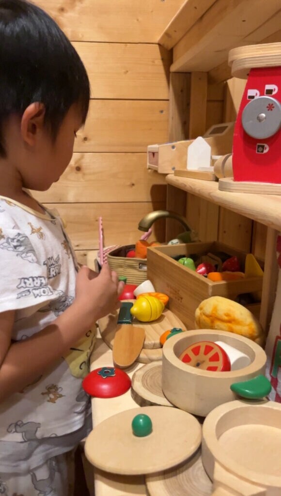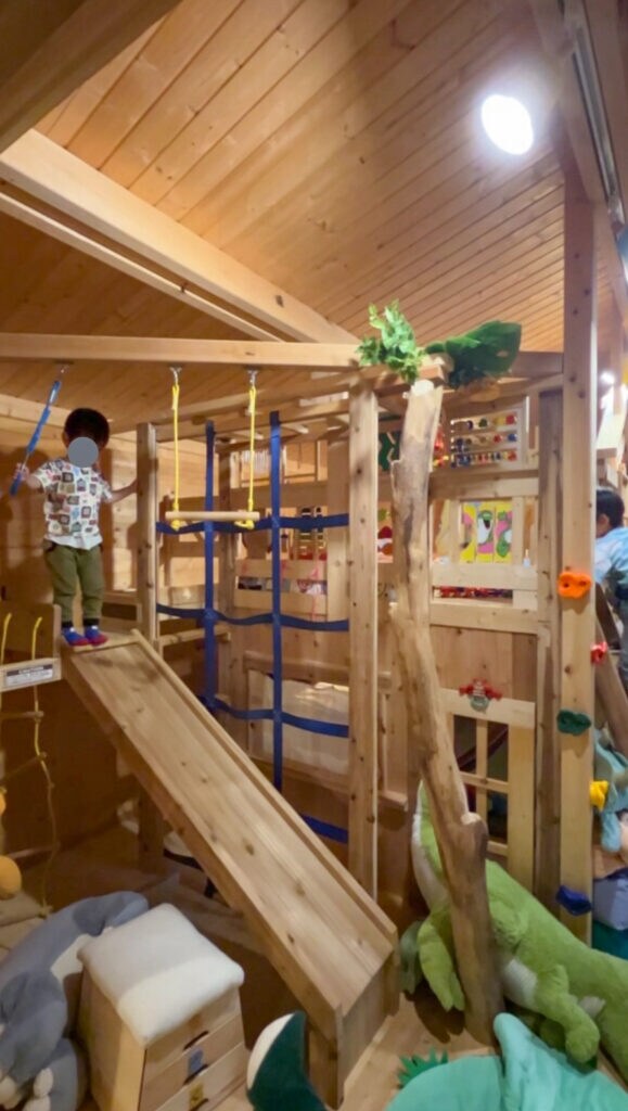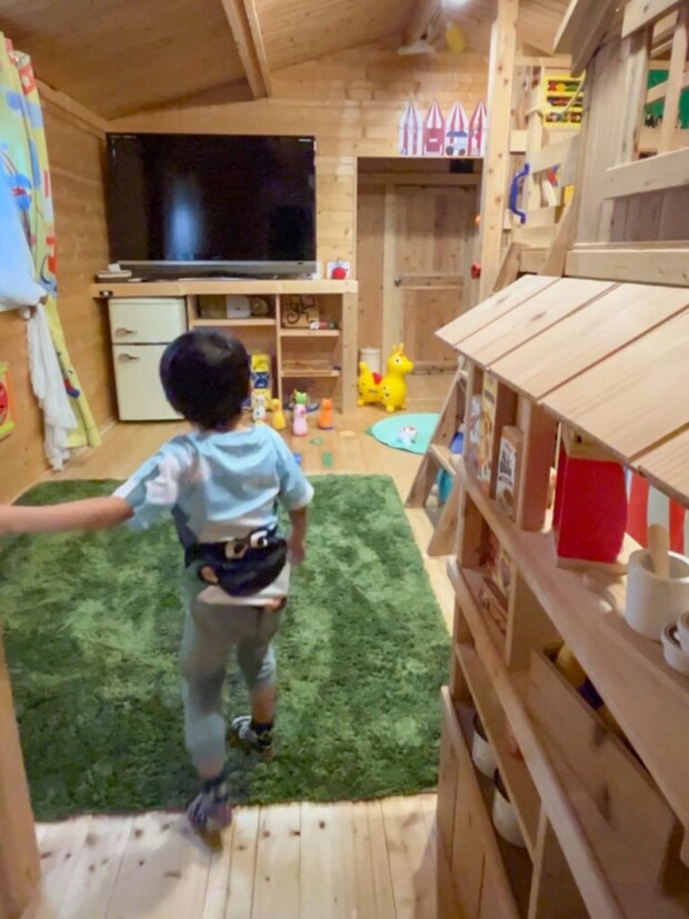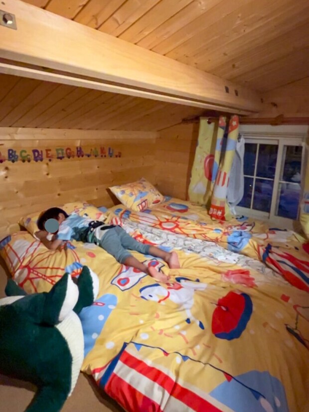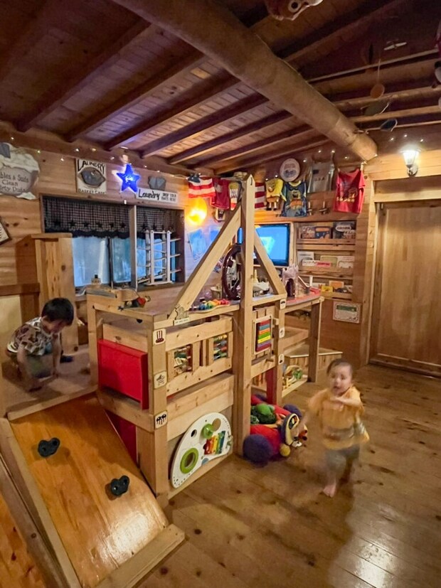 こちらの一棟貸のログハウスには、2段ベッドにすべり台やキッチンセットがついていたり、ミニカーやボードゲームもあって、まるでおもちゃ箱みたいなお部屋に子供達は目がキラキラです。