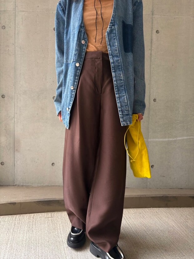 「ブラウンカラーのグラデーションコーデにデニムジャケットを羽織って、さらにトレンド感をアップ。ほっこりしないようビビッドなイエローを差し色に、モードにまとめたのもポイントです」