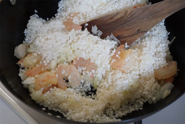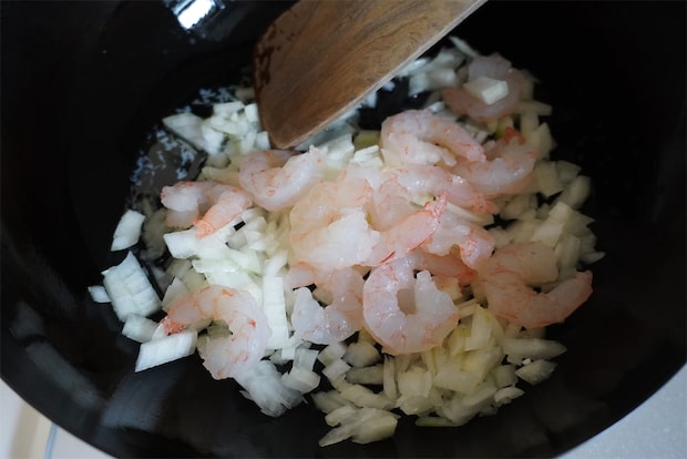 2. フライパンにバターを溶かして玉ねぎとむきエビを炒め、米を加えて炒める。