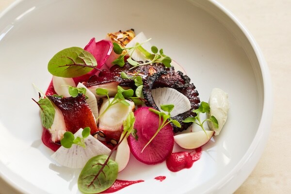 「炭焼きタコのコンフィ ラディッシュのピクルスとゴルゴンゾーラ風味の麹チーズを添えて」は2,500円、