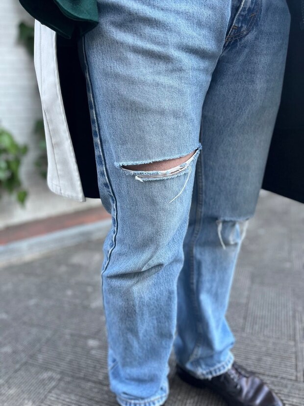 品のある着こなしに対し、デニムはダメージ入りをチョイスしているのも面白い