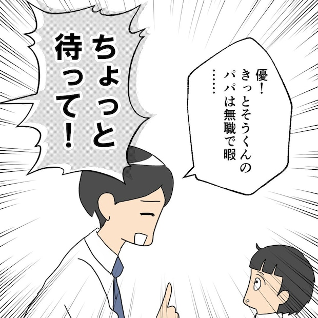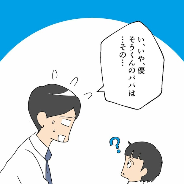 「パパは忙しいから送迎できない」と、言われた優。「お友だちのパパは、毎日ヒマだから送迎しているんだね」と、納得してしまいます。無邪気なかんちがいに、しどろもどろになる狐生。