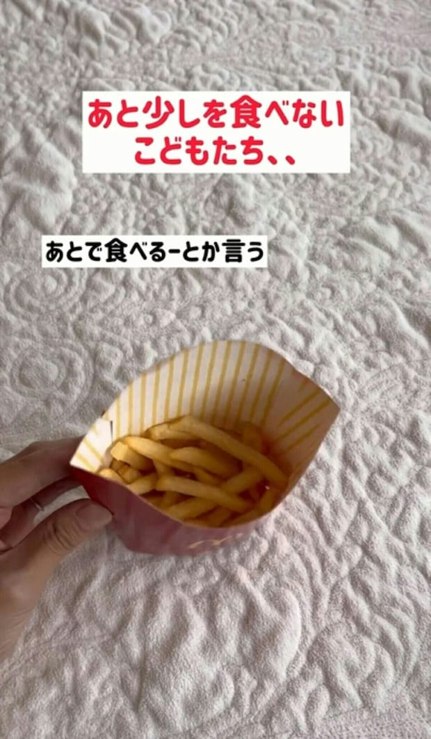 ちょっと残ったフライドポテト。特に子どもが残してしまい「今は食べられないけど、後で食べる」と言われたときは困りますよね。ふたがあるものだと持ち帰りやすいのですが、このケースのままの状態で持ち帰るのは、中身がこぼれてしまう心配もあり、なかなか難しいですよね。