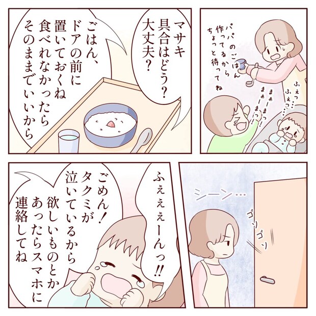 構って欲しい子ども達が泣くなか、急いでマサキのお粥を作って2階に運びました。「具合はどう?大丈夫?」と声をかけて、ご飯をドアの前においておくと伝えました。部屋の中からは返事はありませんでしたが、ごそごそ動く音が聞こえたので意識はあるな、と確認し、「ごめん!タクミが泣いてるから欲しいものとかあったらスマホに連絡してね」とドア越しに伝え、すぐに子ども達のお世話に戻りました。