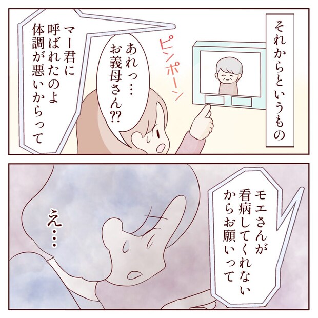 モエさんは、夫マサキさんが、体調が悪くなるとすぐ実家の母を呼んで看病してもらうこと、そして義母も息子に呼ばれて、喜んで甲斐甲斐しく泊まり込みで看病することにモヤモヤしていました。マサキさんは結婚当初から義母を呼んでいたのではなく、あることから義母を呼ぶのは「モエのせい」と思われるようになったのです。