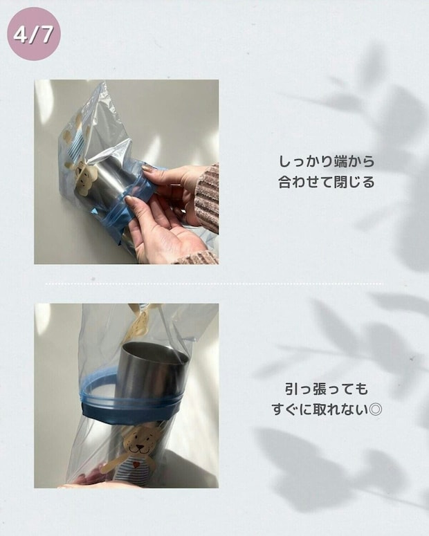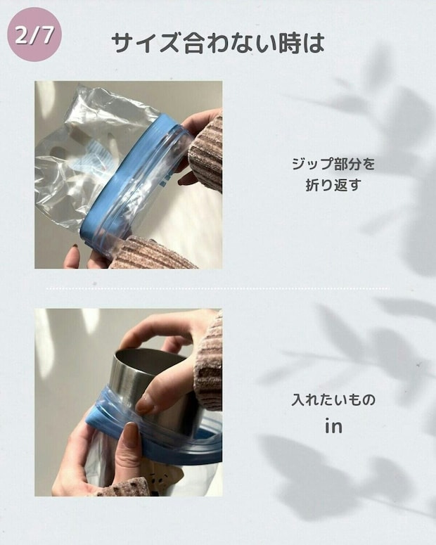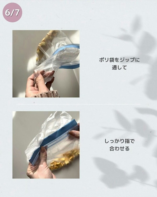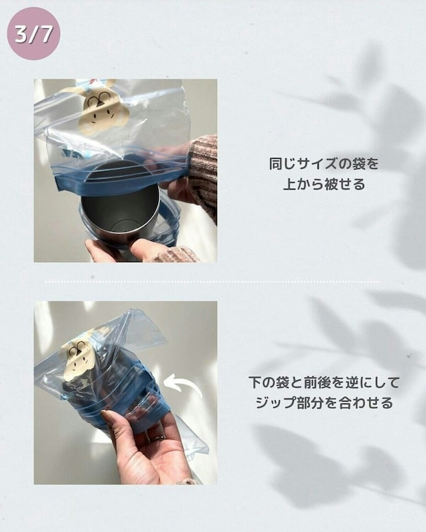 ファスナー部分同士をしっかりと合わせることで、簡単には取れない強度も持ち合わせているようです。大きめサイズの保存袋を切らしてしまったピンチのときも、保存袋2枚を使ったこの方法で乗り切れそうですね。