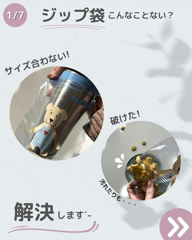 小分け保存や持ち運びに便利なファスナー付きの保存袋。子どもの着替えやおむつ、お菓子、水筒などバッグに入れるときにもぴったりなアイテムですよね。
