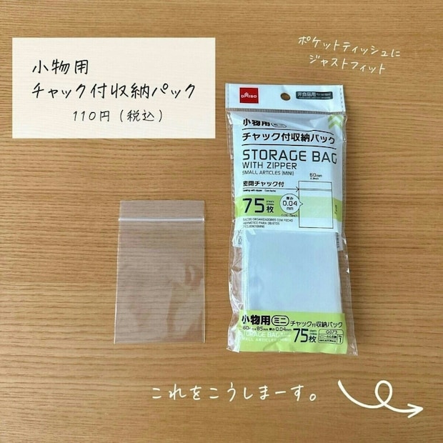 ダイソーで販売されている、「チャック付き収納パック」を用意します。この収納パックがポケットティッシュのサイズにぴったりのようです。
