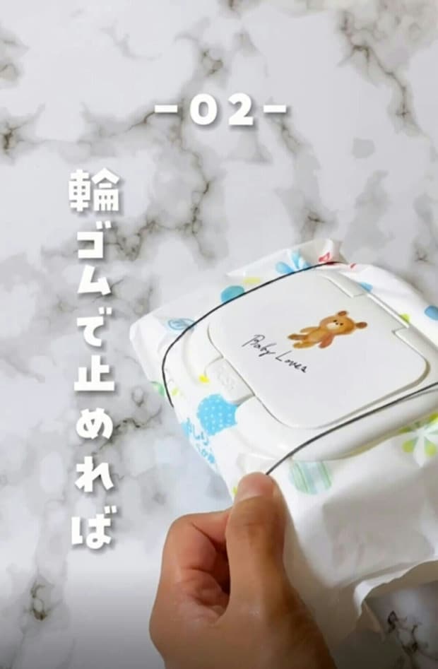 そんなときは、輪ゴム2本を用意し、おしり拭きシートのパックの両端をとめます。