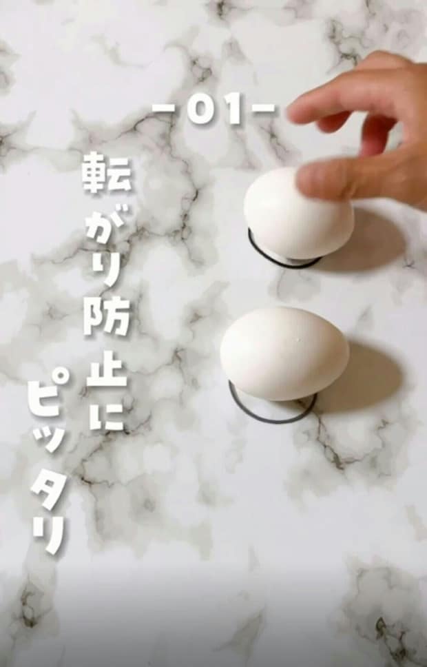 そんなときは、調理台に輪ゴムを置き、その上に卵を置いてみてください。ピタッと止まって、ヒヤヒヤする思いをせずに済みます。