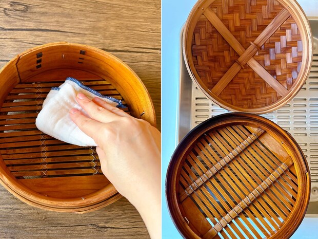 せいろを使用したあとは、基本的に濡らした布巾で表面の汚れを拭き取るだけでOKです。水分をよく拭き取って、吊るすか水切りトレーに立てかけて風通しのよい日陰で乾燥させましょう。