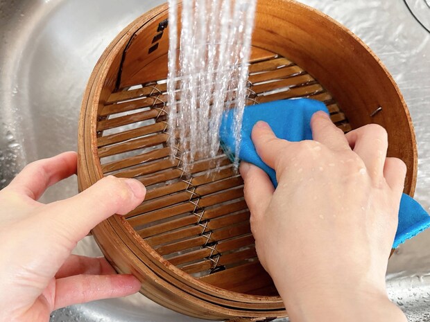 せいろは洗えるので、肉汁や油汚れが付いている場合はぬるま湯でやさしく洗い流します。スポンジを使って擦るときれいになりますよ。洗ったあとは、陰干ししてしっかり乾燥させるのがポイントです。