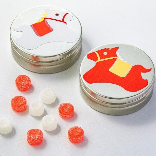 【ヒトツブ カンロ】(左)縁起缶キャンディ 白うま/(右)縁起缶キャンディ 紅うま