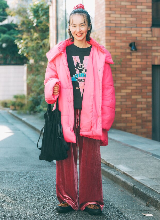 パッと視線を集めるネオンピンクのジャケットがトレードマークのmanamiさんは、『メゾンスペシャル』の大きめサイズを選んで、ルーズな抜け感を演出。ジャケットを主役に、ストンとしたシルエットのピンクのベロアパンツ、ピンクプリントのトップス、ヘアゴムまでピンクをたっぷりと散りばめたラブリーなコーディネート。