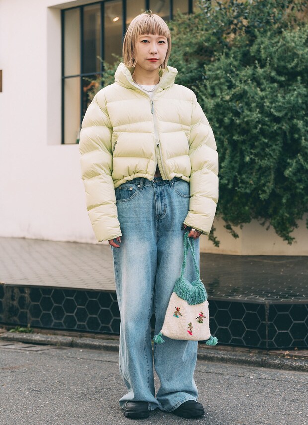 ボリューミィながらコンパクトなシルエットに、ミニマルなデザインですっきり見えを叶えてくれる淡いイエローのダウンジャケットをまとった長尾さん。普段使いのデニムを合わせるだけで、カジュアルながらも華やかさが際立つ今っぽい着こなしに。華やかなカラーアウターならデイリーコーデも簡単にブラッシュアップ!