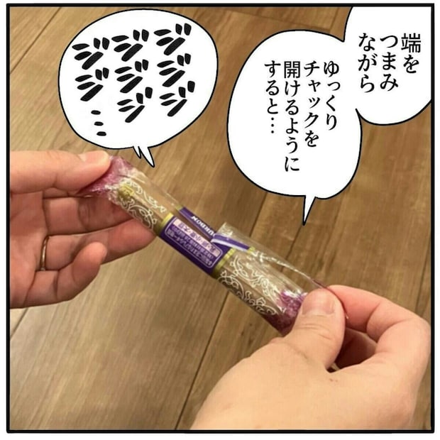 いつも早く食べたい一心で、特に気にすることなく開けていた袋。裏側に向けてつまみの部分を立てるのがポイントだそうです。