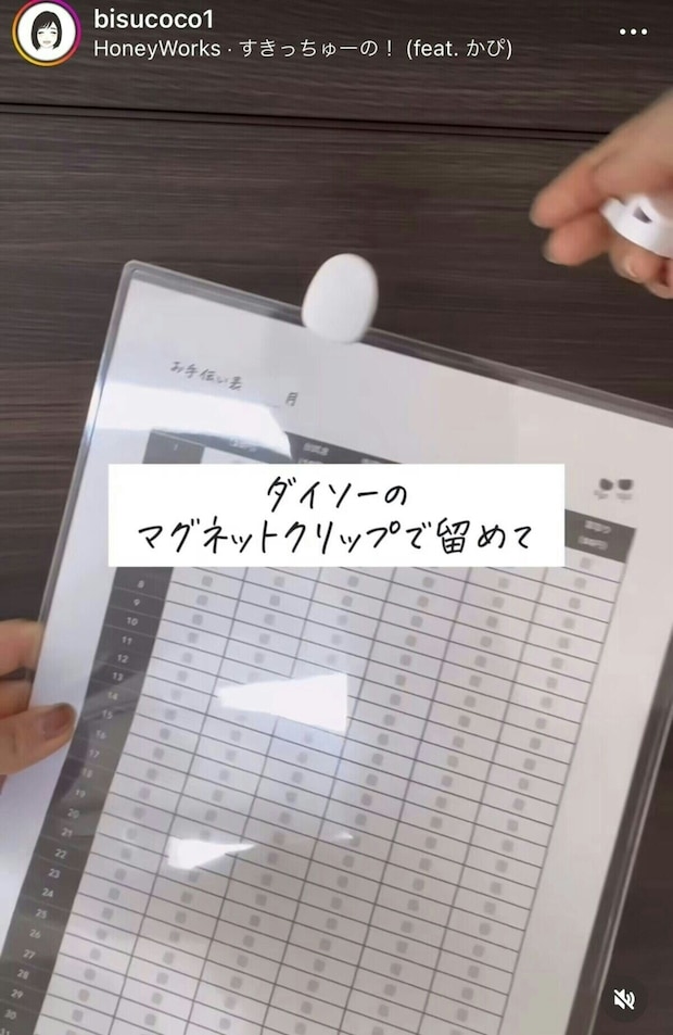 ダイソーで販売されているマグネットクリップを取り付け、冷蔵庫など使い勝手の良いところに貼ります。