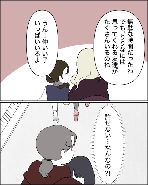 「無駄な時間だったわ。でも、りりなには思ってくれる友達がたくさんいるのね」「うん!仲いい子いっぱいいるよ」と笑顔で帰って行く風見さん親子の背中を眺めながら「許せない・・なんなの?」と怒りがこみ上げました。