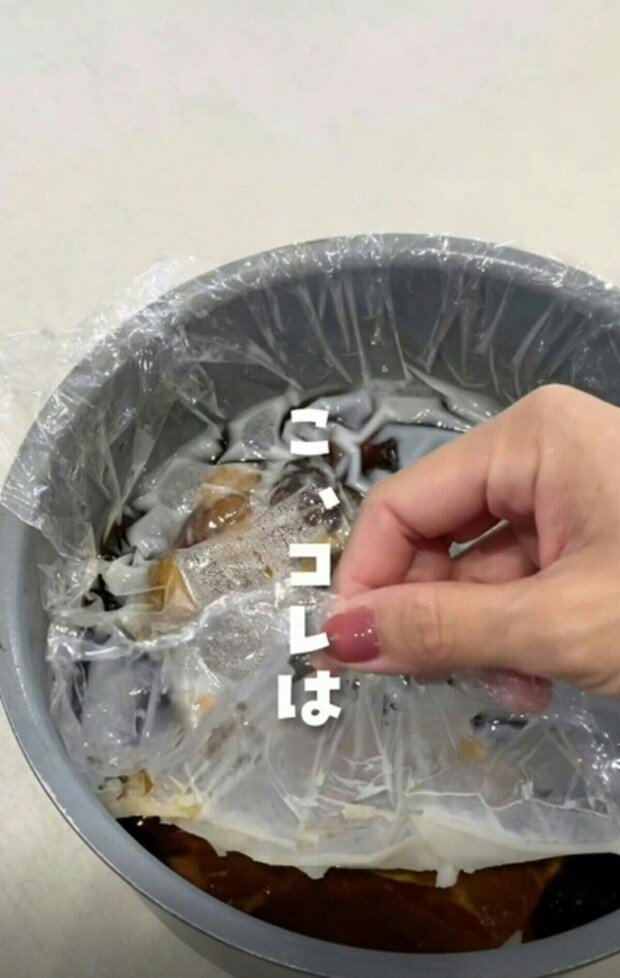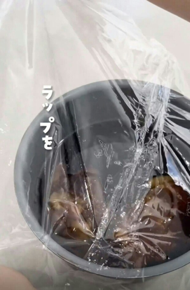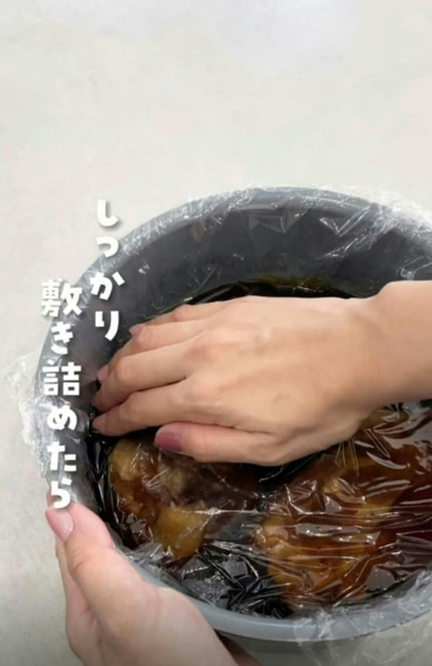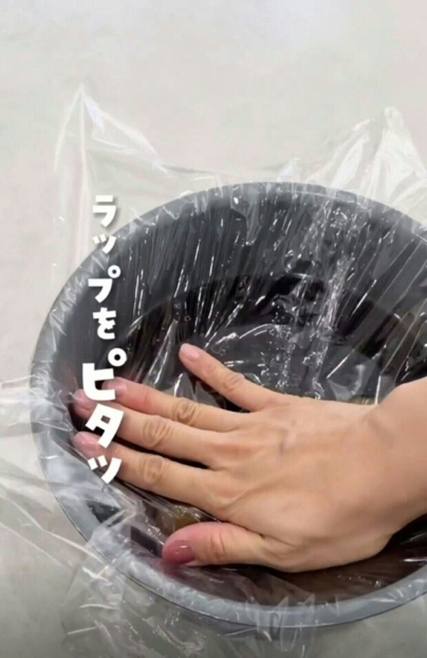料理にラップがピタッと密着させるように敷き込みましょう。