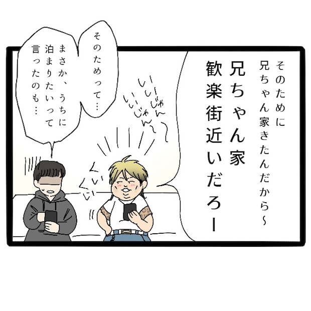 それでも信也君は諦めずに「そのために兄ちゃん家きたんだから~。兄ちゃん家、歓楽街近いだろー。いいじゃん~いいじゃん~」としつこく達也を誘います。達也は信じられないといった表情で「そのためって・・。まさか、うちに泊まりたいって言ったのも・・」と恐る恐る口を開くと、