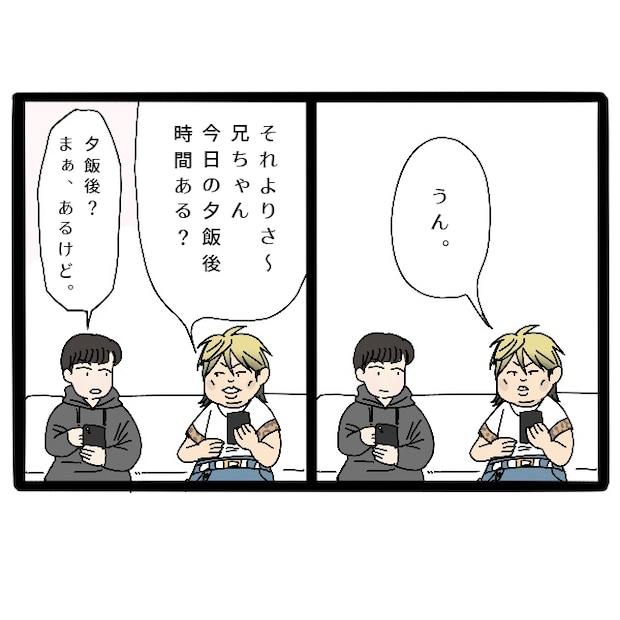 「うん」とあっさり答えた信也君は、「それよりさ~。兄ちゃん今日の夕飯後、時間ある?」と話題変更。「夕飯後?まぁ、あるけど」と達也が答えると、