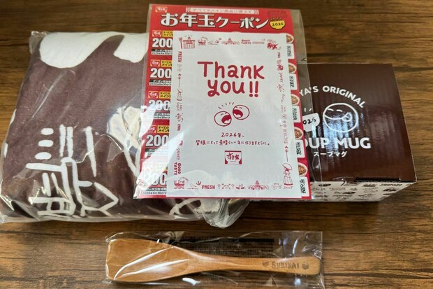 店頭で販売される税込3,500円のボックスには、3,500円分のクーポンに加え、オリジナルのブランケット、スープマグ、木製スプーンがセットになっています。
