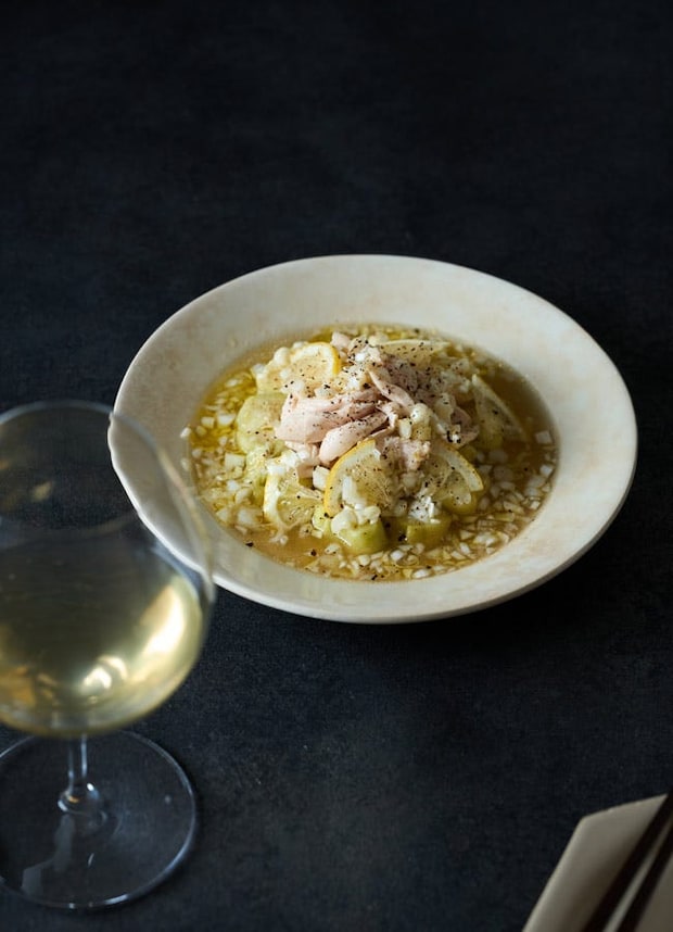 【3】白ネギをみじん切りにし、白だし、水、柚子こしょう、レモン汁、オリーブオイルと混ぜてドレッシングを作り、冷蔵庫で冷やす。