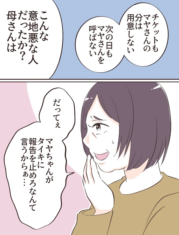 「チケットも用意しない、次の日も呼ばない、こんな意地悪な人だったか?母さんは」そう責められても、義母は往生際悪く、「だってぇ、マヤちゃんがタイキに報告を止めろなんて言うからぁ・・・」と、この期に及んで言い訳を並べ立てました。