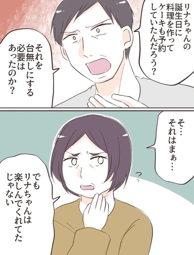 「リナちゃんの誕生日に料理を作って、ケーキも予約していたんだろう?それを台無しにする必要はあったのか?」義父にそう問われると、義母は「それはまぁ・・・」と気まずそうに視線を泳がせました。しかし、自分が責められるのが納得いかないのか「でもリナちゃんは楽しんでくれてたじゃない」と言い返します。