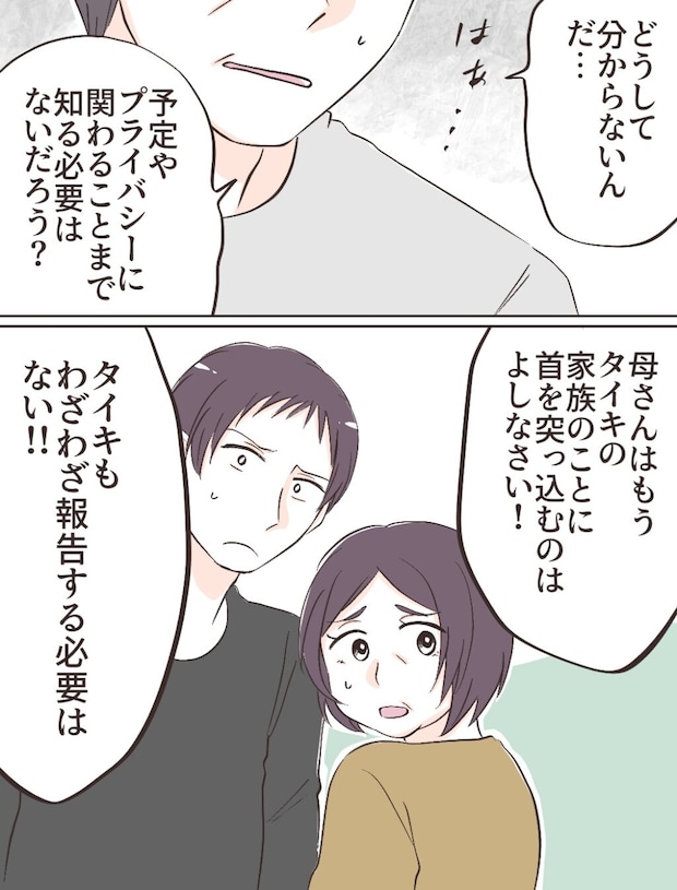 いつまでも自分の非を認めない義母に呆れた義父は「どうして分からないんだ・・・」と深くため息をつきました。そして2人に視線を向けると、「母さんはもうタイキの家族に首を突っ込むのはよしなさい!タイキもわざわざ報告する必要はない!」と言い放ったのです。