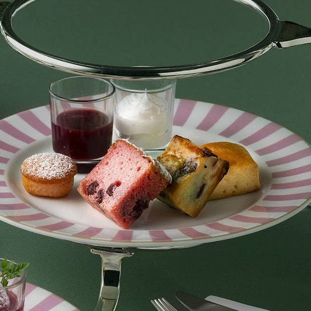 続いてこちらのプレートには、ローズヒップティーを練り込んだ生地にドライクランベリーを合わせた「ローズヒップパウンドケーキ」、ほのかな桜の香りが広がる「フィナンシェ」を用意。アフタヌーンティーに欠かせないスコーンは、噛むほどに甘酸っぱさが口いっぱいに広がるクランベリーとプレーンの2種を、ラズベリージャムやクロテッドクリームと一緒にどうぞ。