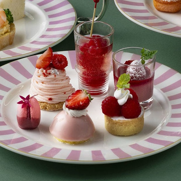 まずこちらのプレートには、マスカルポーネといちごの口福なハーモニーを楽しめる「いちごモンブラン」、赤く輝くラズベリーとレッドカラントを添えた華やかな「シャンパーニュラズベリースープ」、ラズベリーの豊かな果実味とつぶつぶ感が魅力の「フランボワーズプリン」など6種がラインナップ。