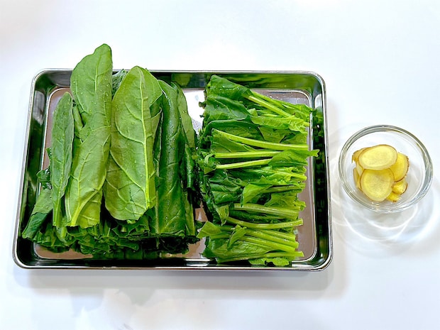 1. ほうれん草はよく洗い、根元を切り、2〜3等分の長さに切る。