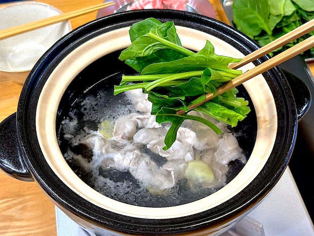 3. 豚肉、ほうれん草を適量ずつ加える。