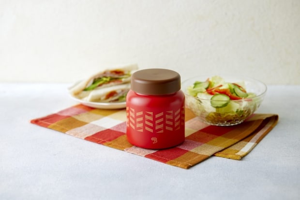 いつもの食卓に彩りを添える赤いスープジャーに、ヘリンボーンをモチーフにした柄をプリント。保温・保冷力に優れ、食べごろの温度を維持できるという。